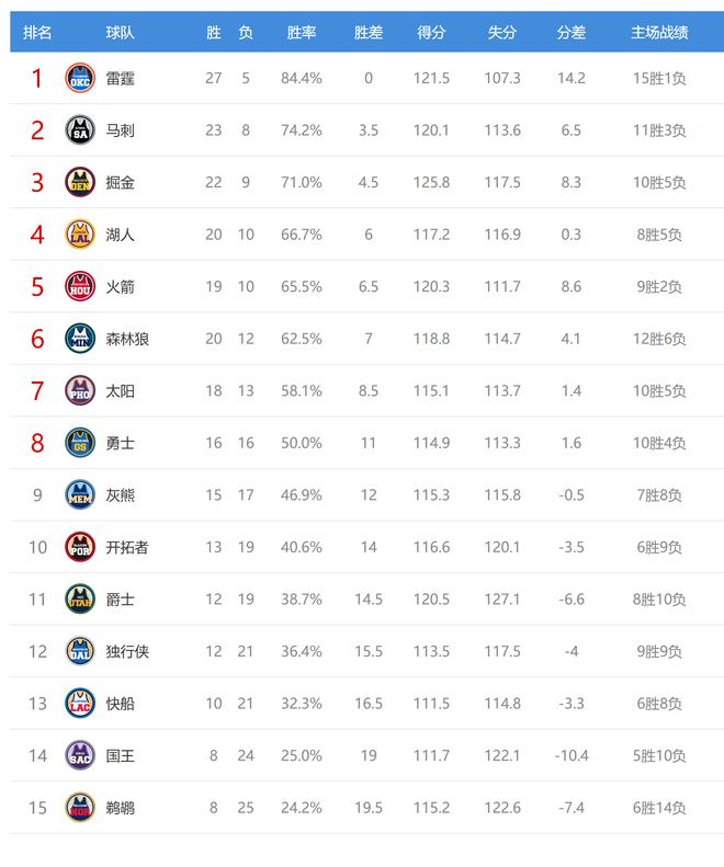 雷霆赢球后结束2连败,战绩27胜5负排名西部第一,也是联盟第一。