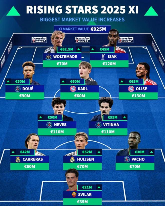 德转列2025年身价涨幅最高11人阵容:奥利塞领衔,伊萨克在列
